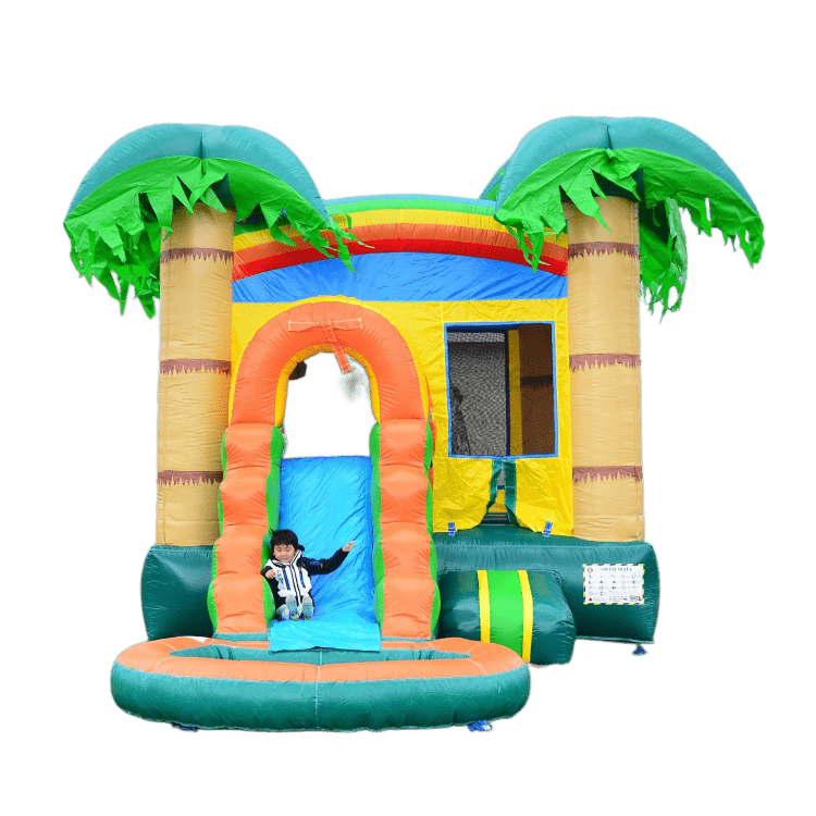 Bring the island vibes right to your backyard with this commercial-grade tropical bounce house with slide and splash pool! 🌴🏝️ Kids will love bouncing, sliding, and splashing while enjoying the bright tropical theme.